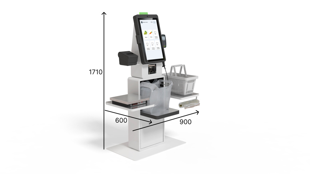 Касса самообслуживания «POScenter SCO-K210 Mod_V2» — разработана для форматов супермаркет и гипермаркет, удобной модульной тумбой с полками, с повышенным требованием к объему «корзины» покупателя.