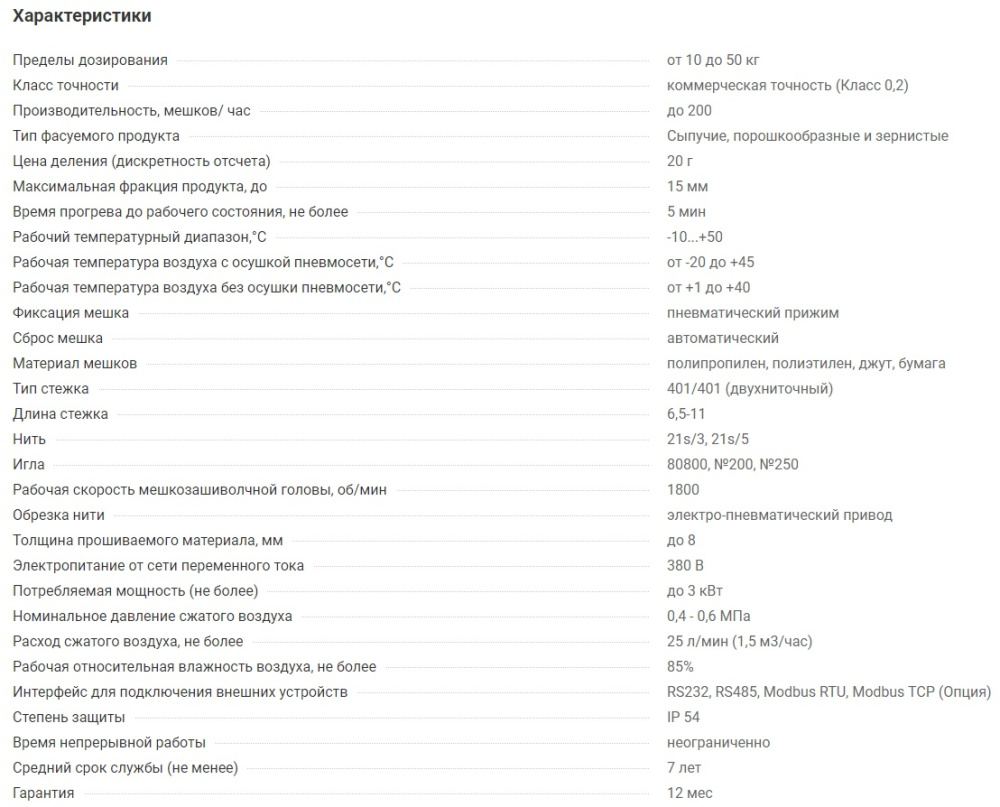 В линию включен дозатор для фасовки, транспортер для отвода мешка в зону зашивки и мешкозашивочная станция с регулировкой под высоту мешка.