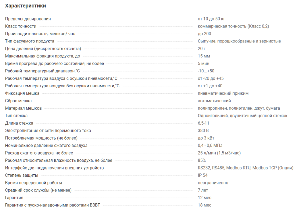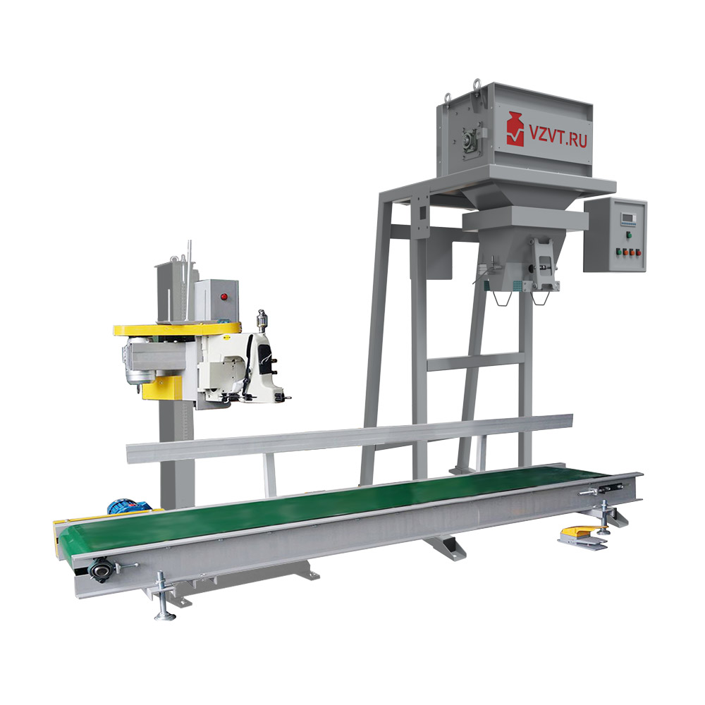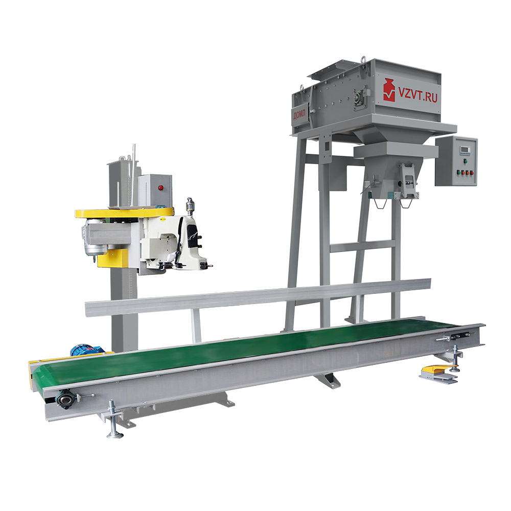 В линию включен дозатор для фасовки, транспортер для отвода мешка в зону зашивки и мешкозашивочная станция с регулировкой под высоту мешка.