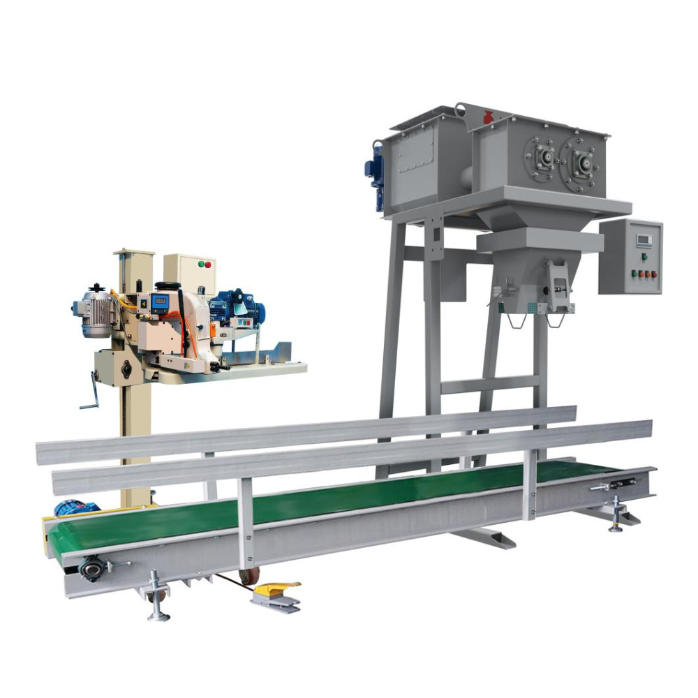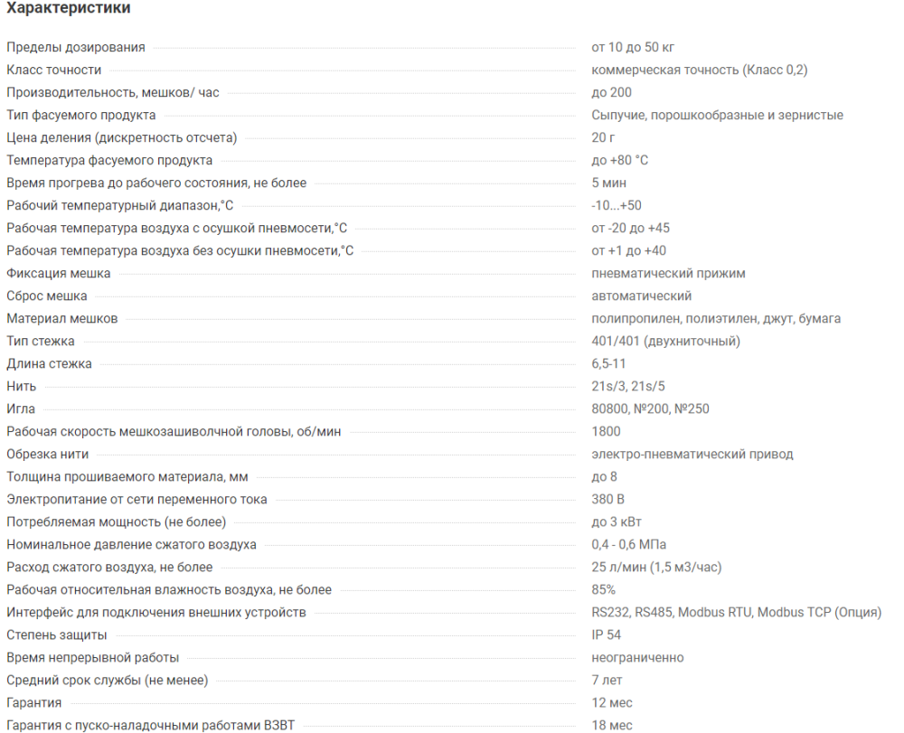 В линию включен дозатор для фасовки, транспортер для отвода мешка в зону зашивки и мешкозашивочная станция с регулировкой под высоту мешка.